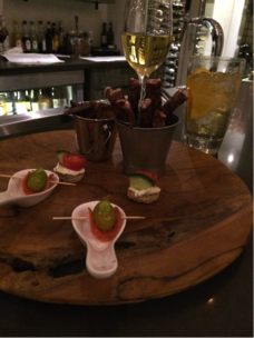 We started out with snacks and drinks in the bar. Biltong (similar to beef jerky), droe wors (another type of cured meat), and canapes were served, with a lovely Chenin Blanc for me and South African gin for Steve. The little bite in the spoon (pictured below) was quite interesting: pepperoni, a grape, and a little dab of wasabi! That gave quite the kick!