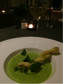 Course 1 – Broccoli and baby marrow soup with basil and cheese pastry straws