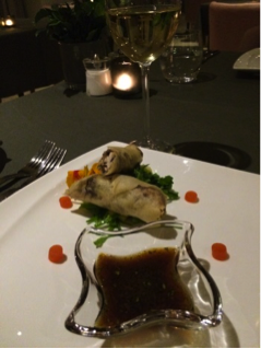 Course 2 – Chicken and vegetable spring rolls with pepperdew jelly, ponsu dipping sauce, and salad