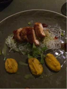 Main Course – Wasabi and panko crusted chicken breast with green coconut sauce, red pepper chutney, rice noodles, and butternut puree