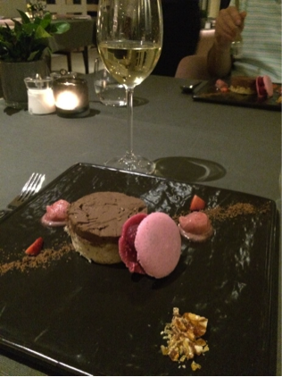 Dessert Course – as if there was room! – chocolate mousse, raspberry macaroon, berry coulis, berry sorbet, and chocolate dusting