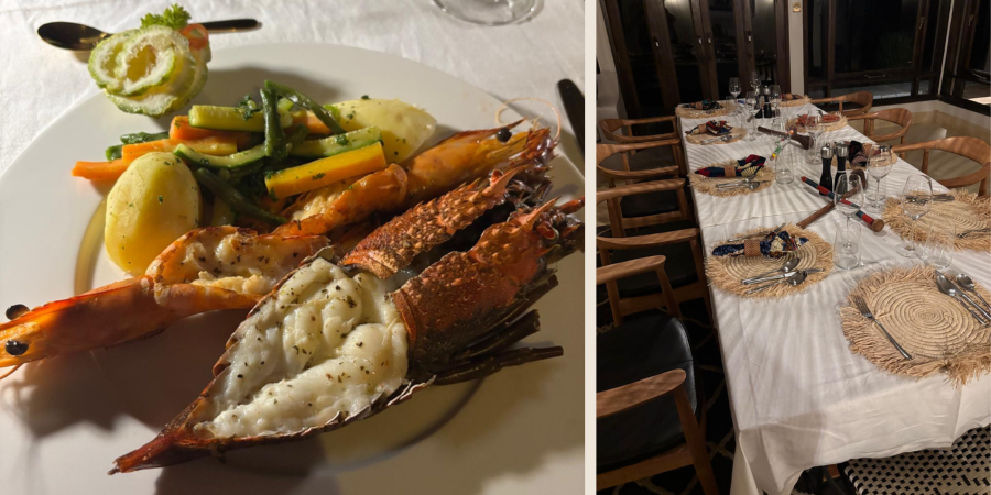 Cocktails were served at the beach patio overlooking the ocean at Garden Villa. Then, on the lower patio with waves in the background, dinner arrived: a beautiful lobster accompanied by two grilled langoustines from Somalia, salt potatoes, and vegetables. Homemade ice cream provided the sweet finish to a meal that perfectly captured coastal Kenya’s culinary abundance.