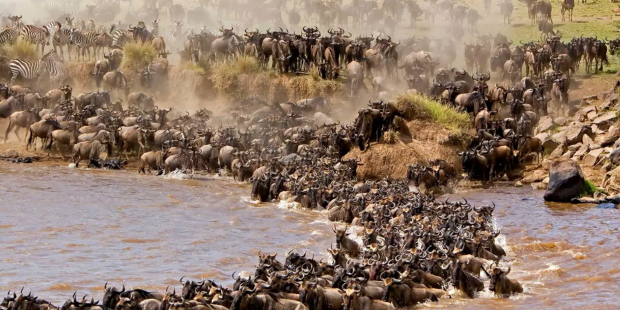 When a crossing happens, it’s overwhelming. Thousands of wildebeest launch themselves into the river simultaneously, fighting the current, navigating submerged rocks, avoiding crocodiles that have waited weeks for this moment. The noise is thunderous and their survival instinct is on full display.