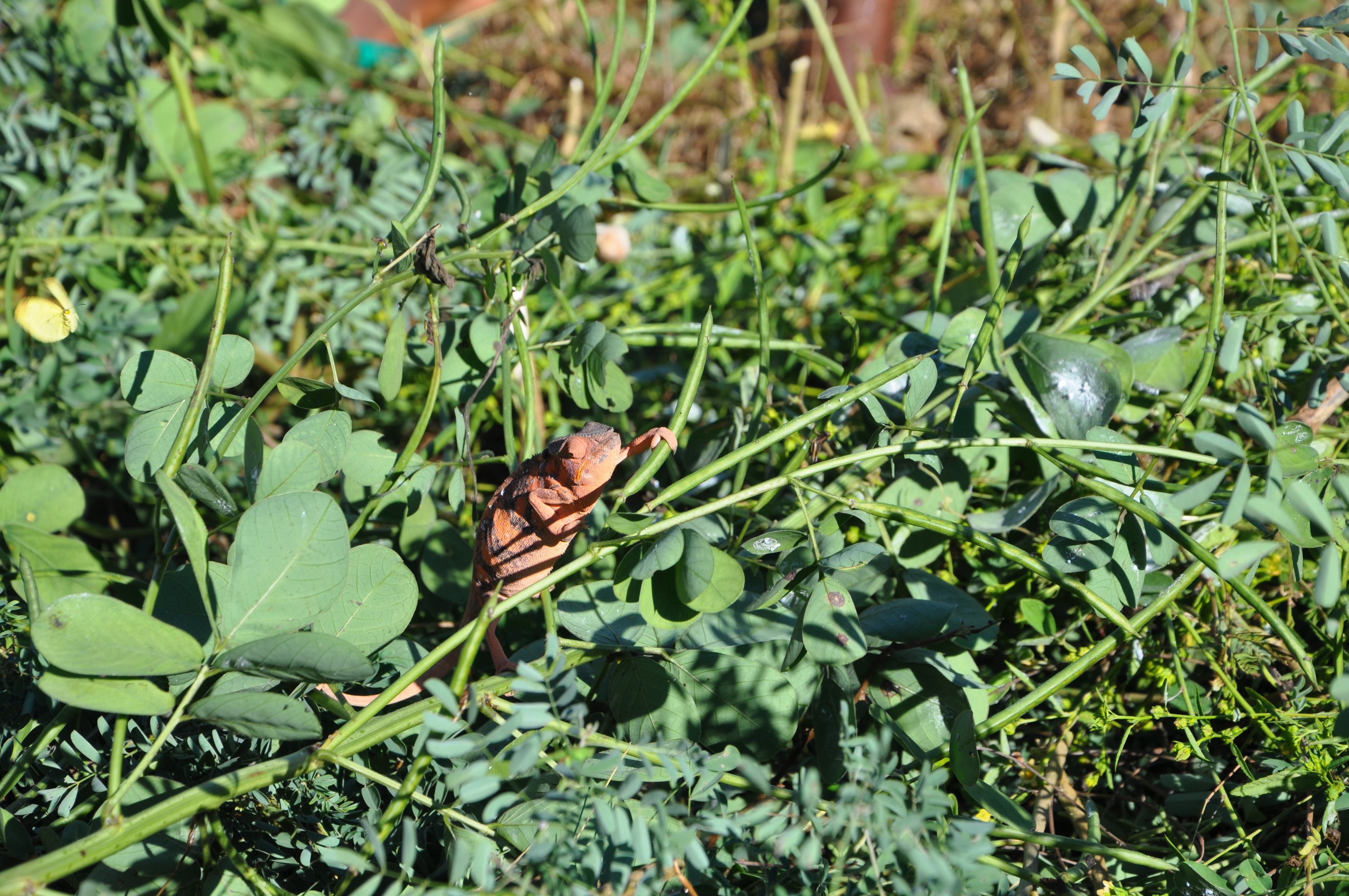 As he approached the bushes where the female was we noticed he stopped. Something had caught his eye. After a moment of preparation the chameleon slung his tongue out almost four inches and snatched up a fly! And I caught part of his kill on camera, so see below: